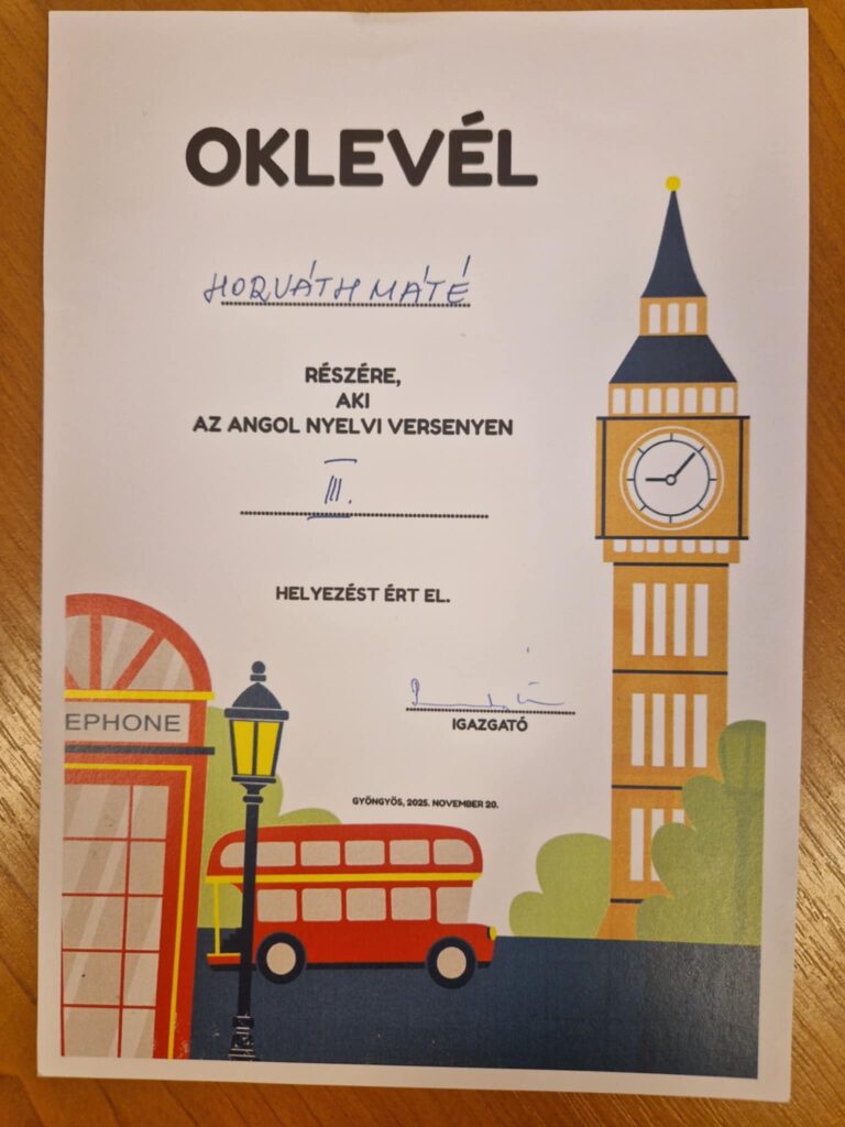 Cseh Annabella és Horváth Máté az angol nyelvi versenyen III. helyezést értek el, így oklevéllel és elismeréssel térhettek haza. A verseny során kreatív nyelvi feladatokat oldottak meg, csapatban és egyénileg is bizonyították tudásukat, rátermettségüket.