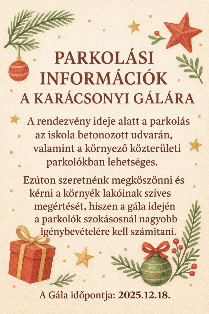 A rendezvény ideje alatt a parkolás az iskola betonozott udvarán, valamint a környező közterületi parkolókban lehetséges.