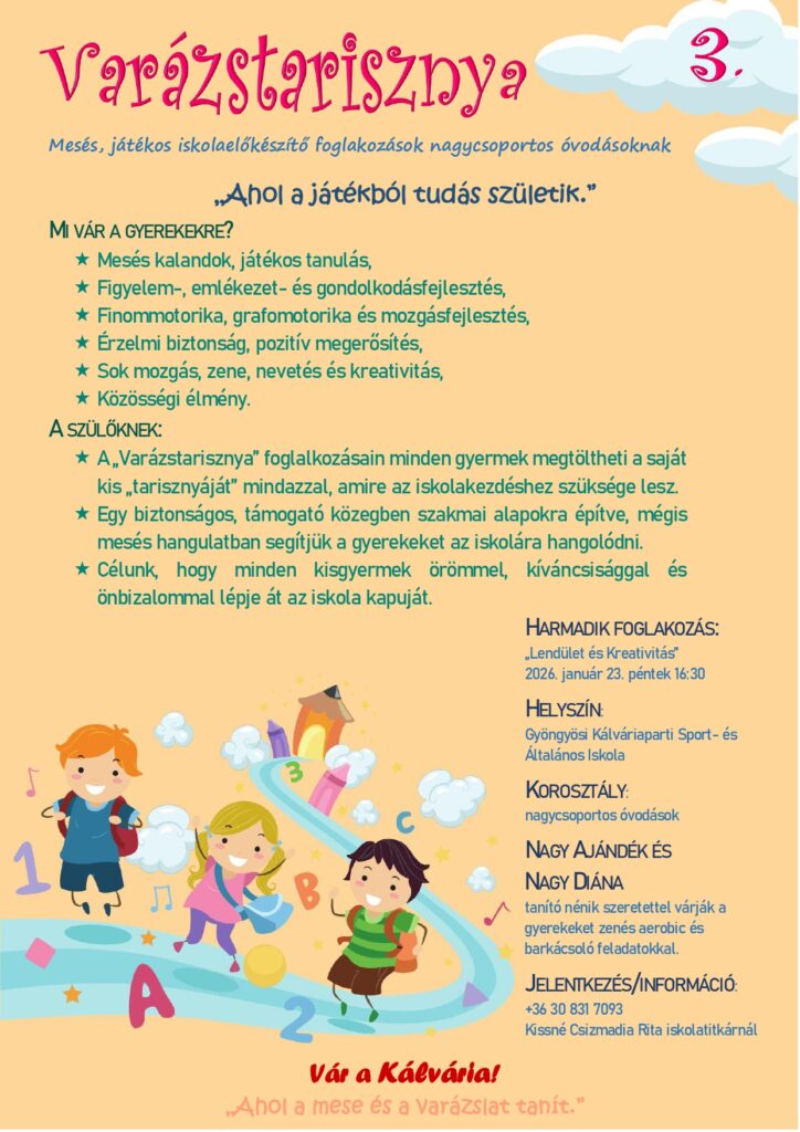 A Varázstarisznya harmadik alkalommal megrendezett játékos foglakozásán amíg a gyerekek Nagy Ajándék és Nagy Diána tanító nénivel aerobic- és barkácsprogramon vesznek részt, addig a szülők megismerkedhetnek a leendő elsős tanító nénikkel, Kandikó-Sutus Csillával és Salga Annával.