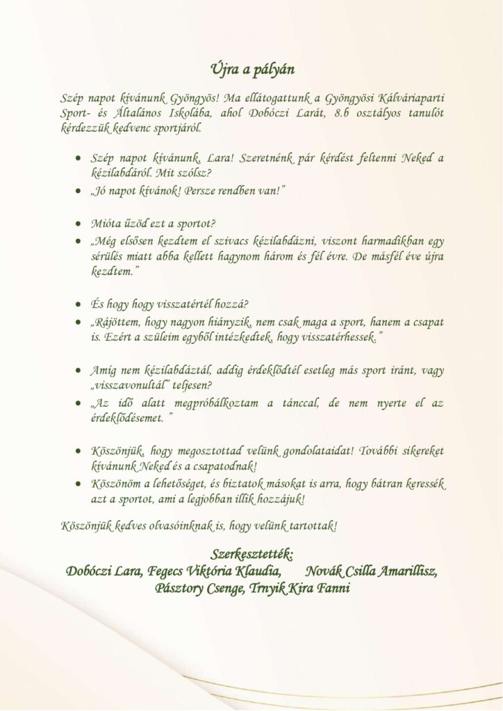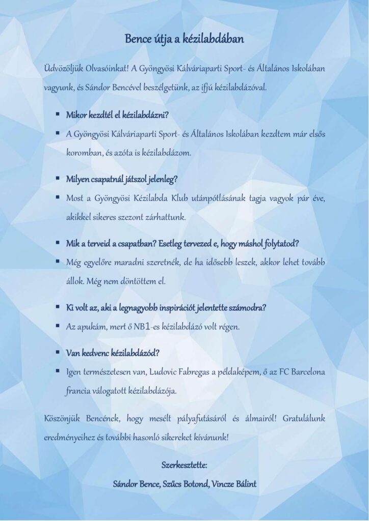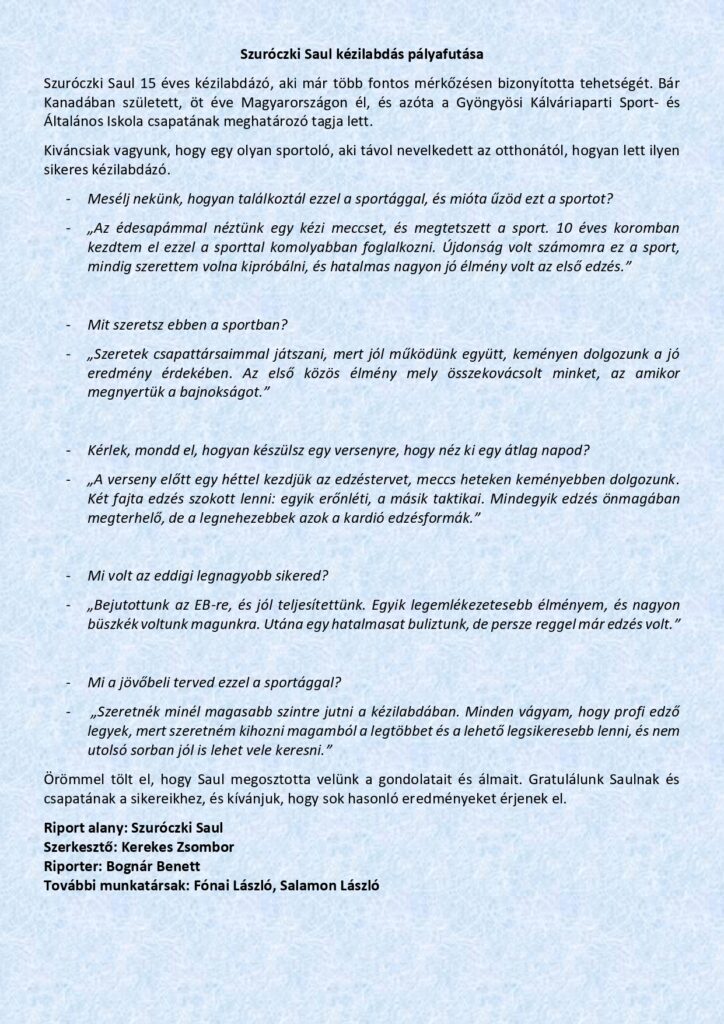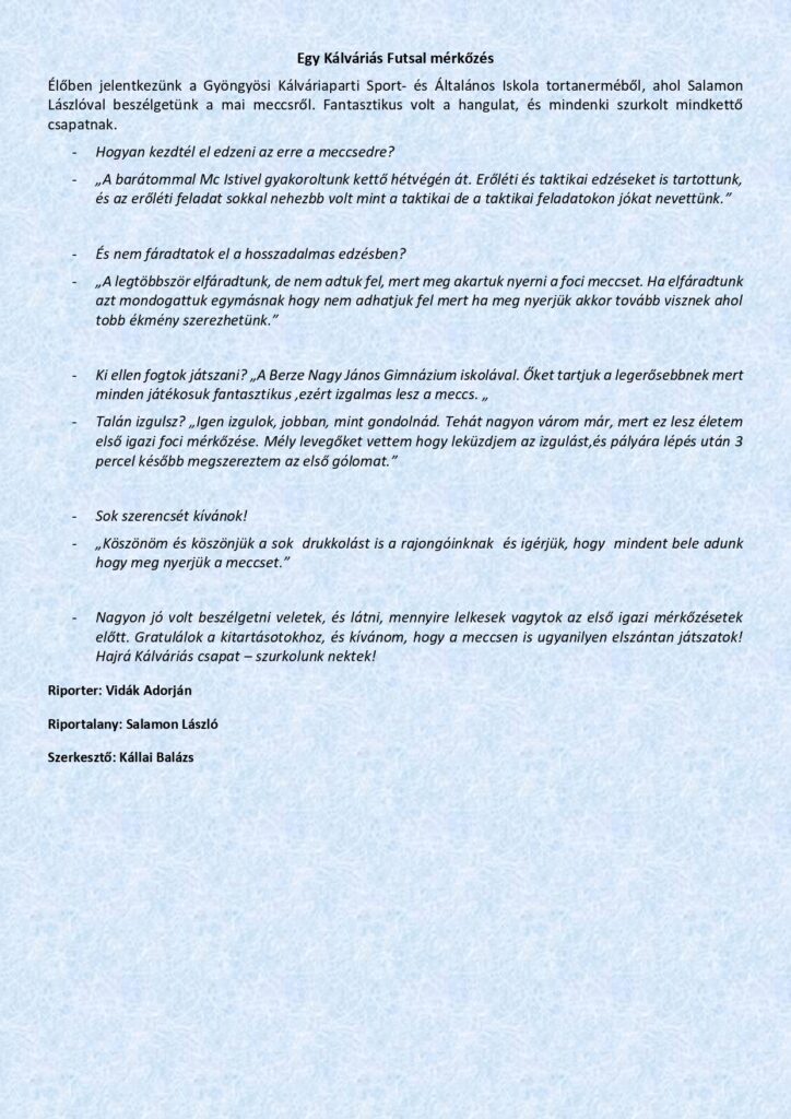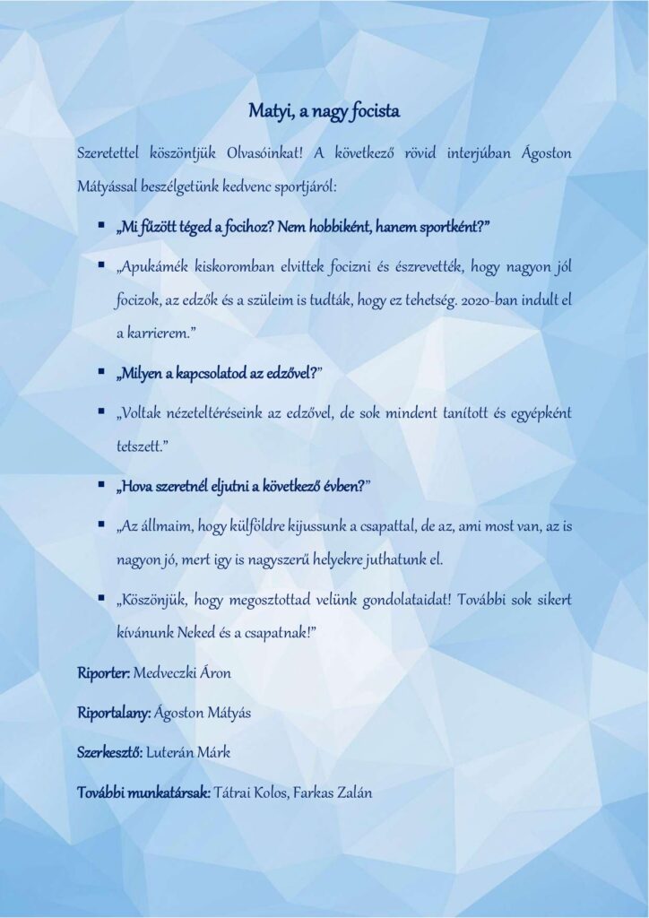 A téli időszak csendesebb, elmélyülős napjai remek lehetőséget adtak arra, hogy tanulóink sportcikkei elnyerjék végső formájukat. A foglalkozás során született írások közül most néhány bátor vállalkozó munkáját szeretnénk bemutatni.