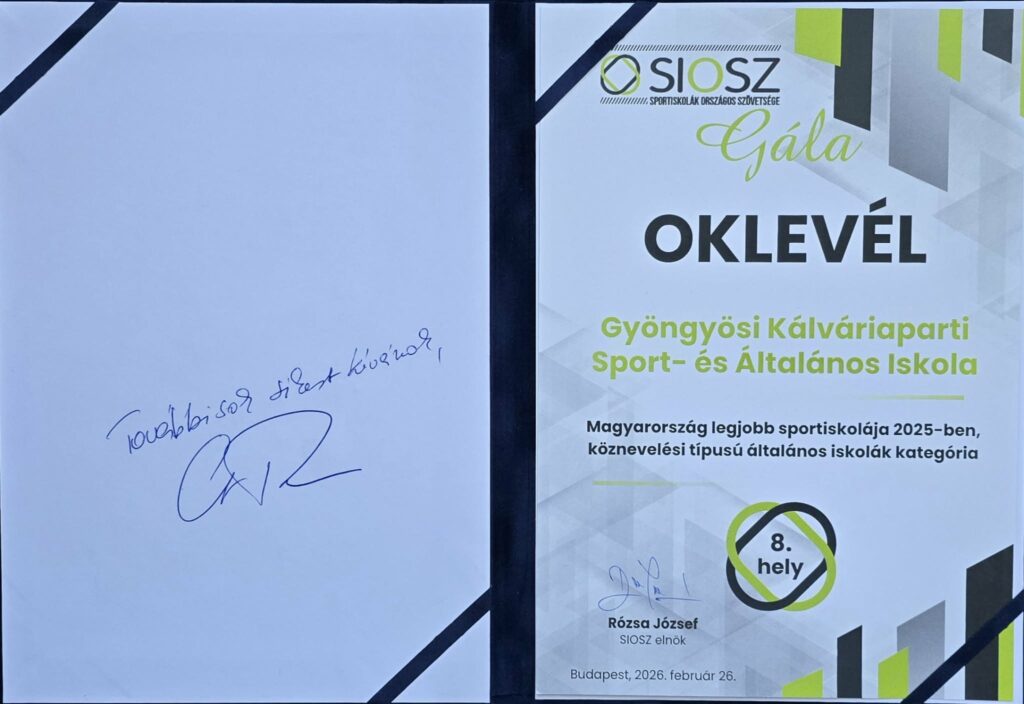 A Gyöngyösi Kálváriaparti Sport- és Általános Iskolát idén különleges megtiszteltetés érte: meghívást kapott a Sportiskolák Országos Szövetségének (SIOSZ) díjátadó gálájára, amelyet 2026. február 26-án rendeztek meg a Magyar Sportok Házában. A rangos eseményen iskolánkat Nagy‑Füleki Renáta igazgatónő és Reviczki Tamás testnevelés munkaközösség-vezető képviselte.